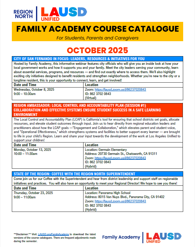 LAUSD Region North September Family Academy Course Catalogue Please see the attached flyer for more information. Attached Files OCTOBER_2025_NORTH_Course_Catalogue_ENGLISH_3.pdf OCTOBER_2025_REGION_Course_Catalogue_SPANISH_3.pdf