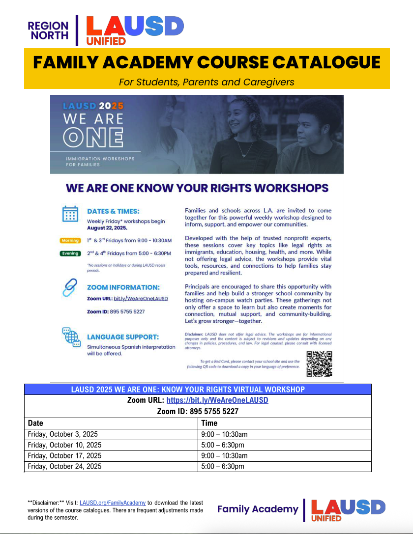 LAUSD families are invited to join a weekly workshop series designed to inform, support, and empower our communities. Developed with trusted nonprofit partners, these sessions cover important topics like immigrant rights, education, housing, and health. While not offering legal advice, they provide valuable resources and connections to help families stay informed and resilient.