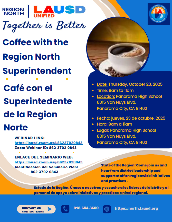 Coffee with Region North Superintendent Attend in person or on Zoom Webinar ID: 862 3702 0843 Come join us and hear from district leadership and support staff on regionwide initiatives and practices. Attached Files 10.23.25_Coffee_with_the_RN_Superintendent (1).pdf