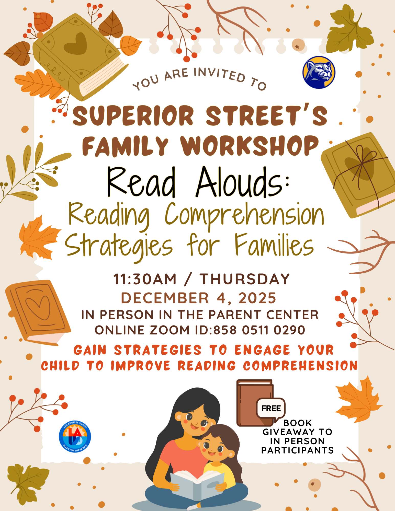 Please join us on Thursday, December 4, 2025, at 11:30 a.m. for a fun and informative parent workshop all about the power of reading aloud. Discover simple, effective strategies to keep your child engaged, strengthen their reading comprehension, and inspire a lifelong love of books. You can join us in person in the Parent Center or online via Zoom, Meeting ID 858 0511 0290. And as a special bonus, free children’s books will be given to all in-person participants.